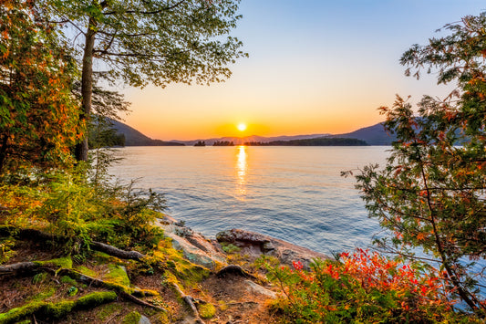 A foreground of Adirondack boulders, roots, moss, and early fall foliage frame this colorful landscape photo of a warm sunset shining through the peaks of Cat Mountain and the narrows of Lake George. Taken from Commission Point and capturing the view of Watch, Hermit, and Big Burnt Islands.